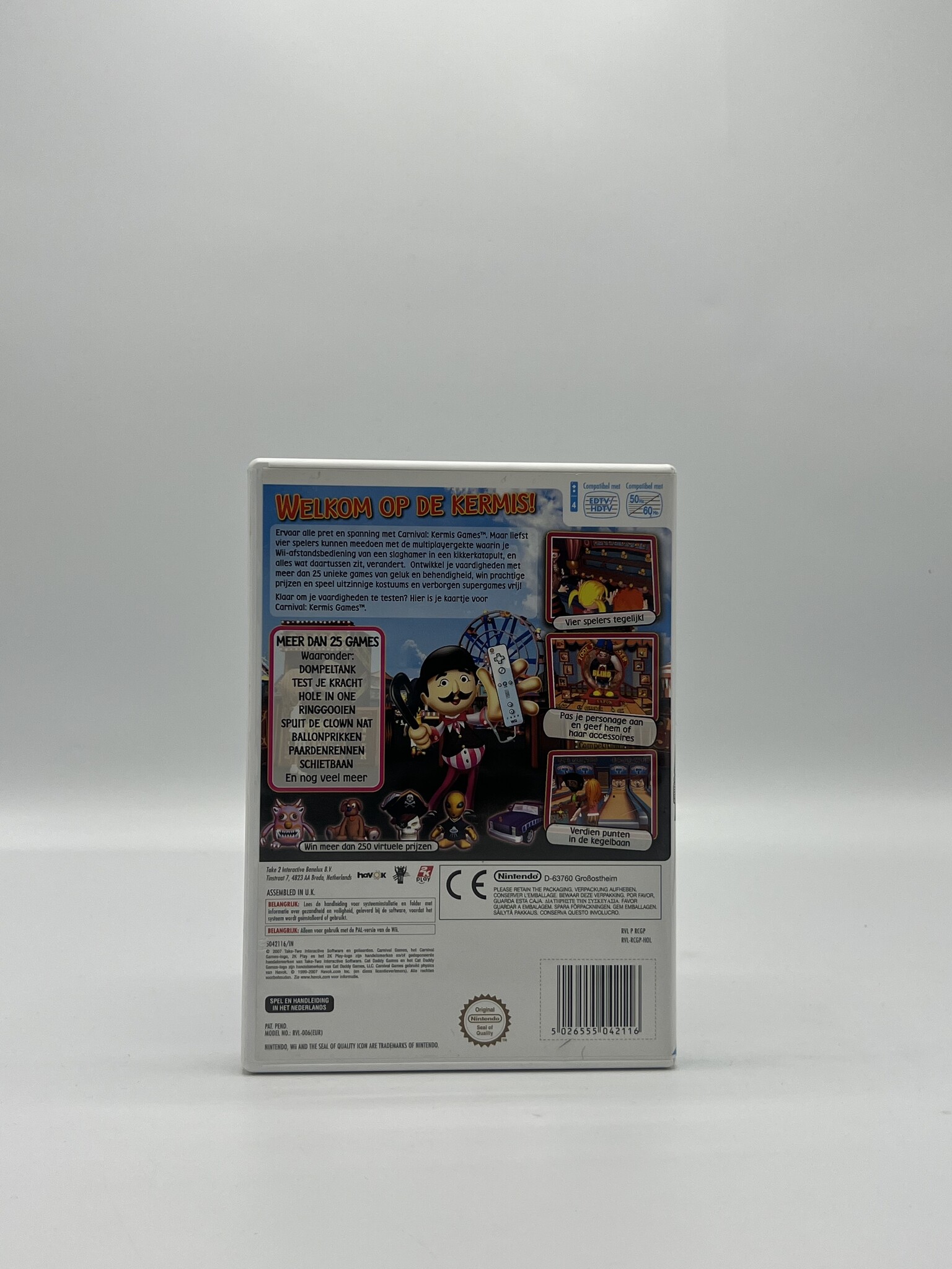 Carnival Games brengt de sfeer van een echte kermis naar de Nintendo Wii met een grote verzameling leuke en toegankelijke minigames. Van ringwerpen en schieten op doelen tot basketbal en andere kermisattracties: met de Wii-bewegingsbesturing voelt elke activiteit speels en interactief aan. De game is perfect voor korte speelsessies met familie of vrienden en biedt plezier voor spelers van alle leeftijden.