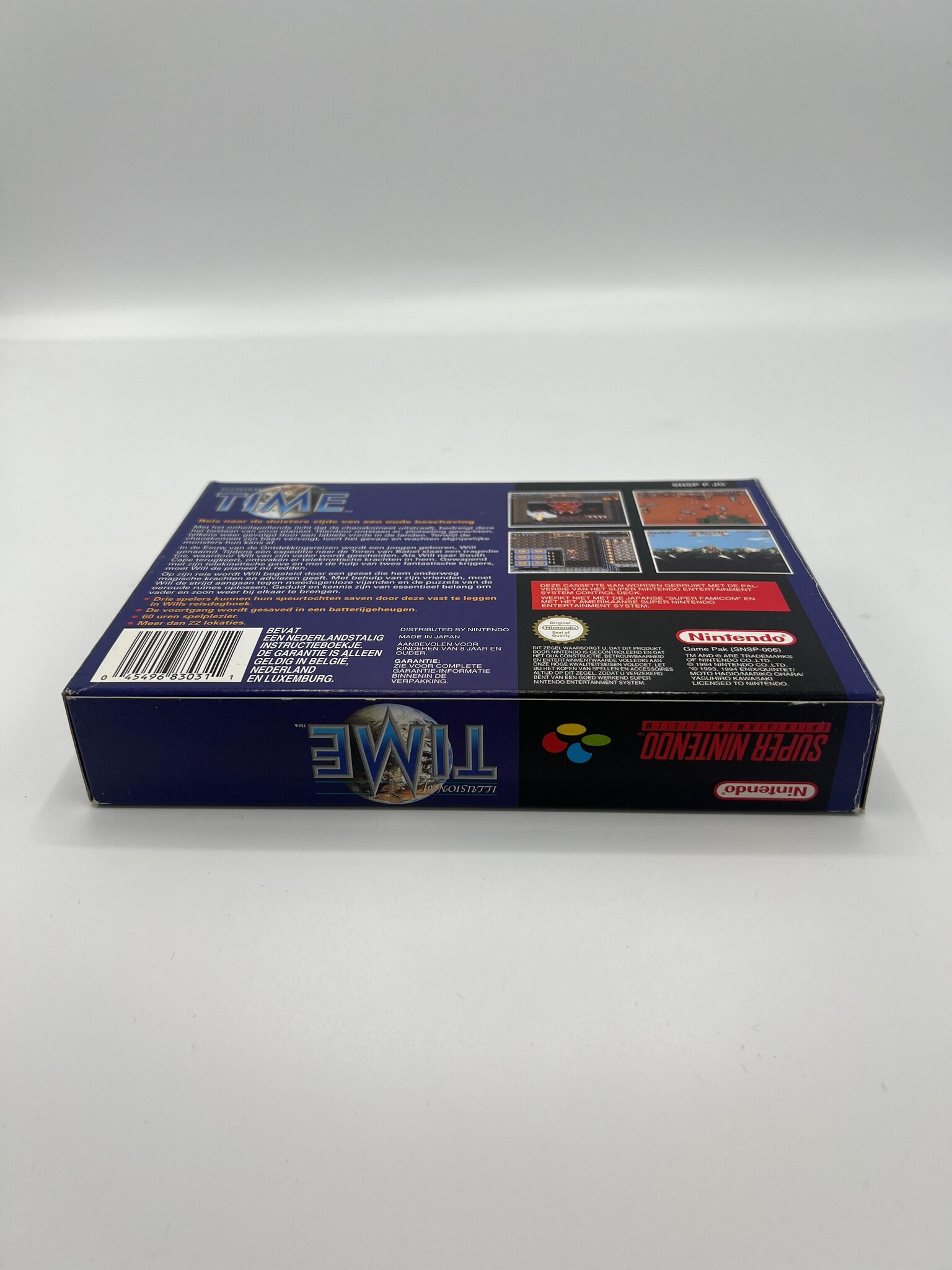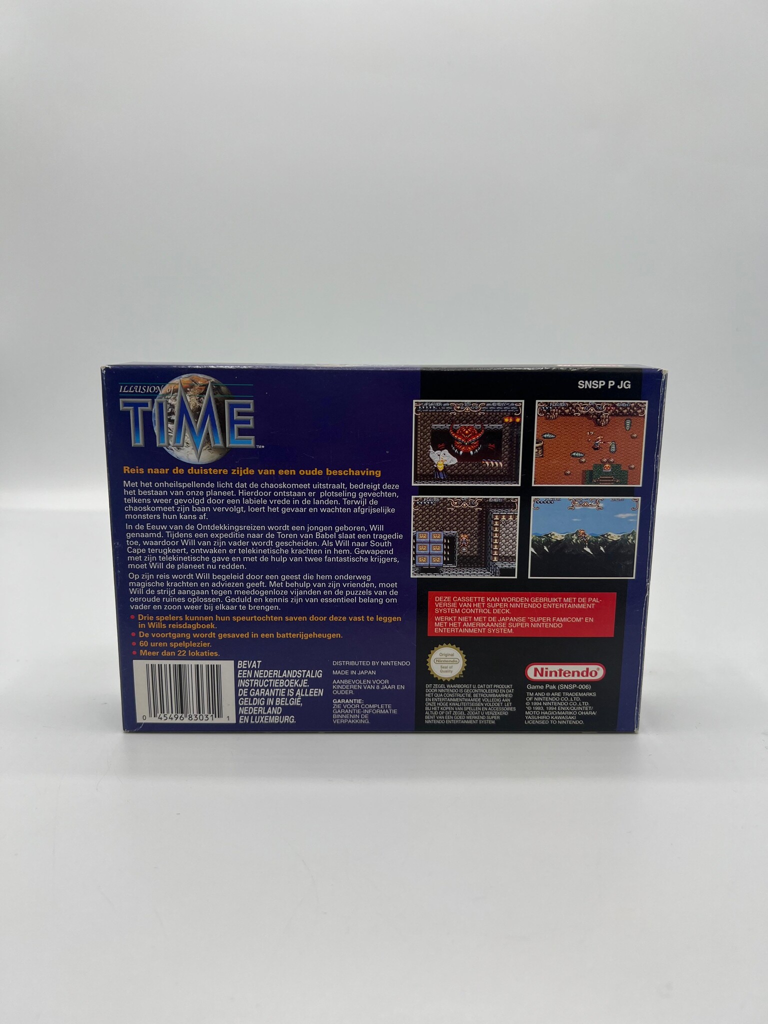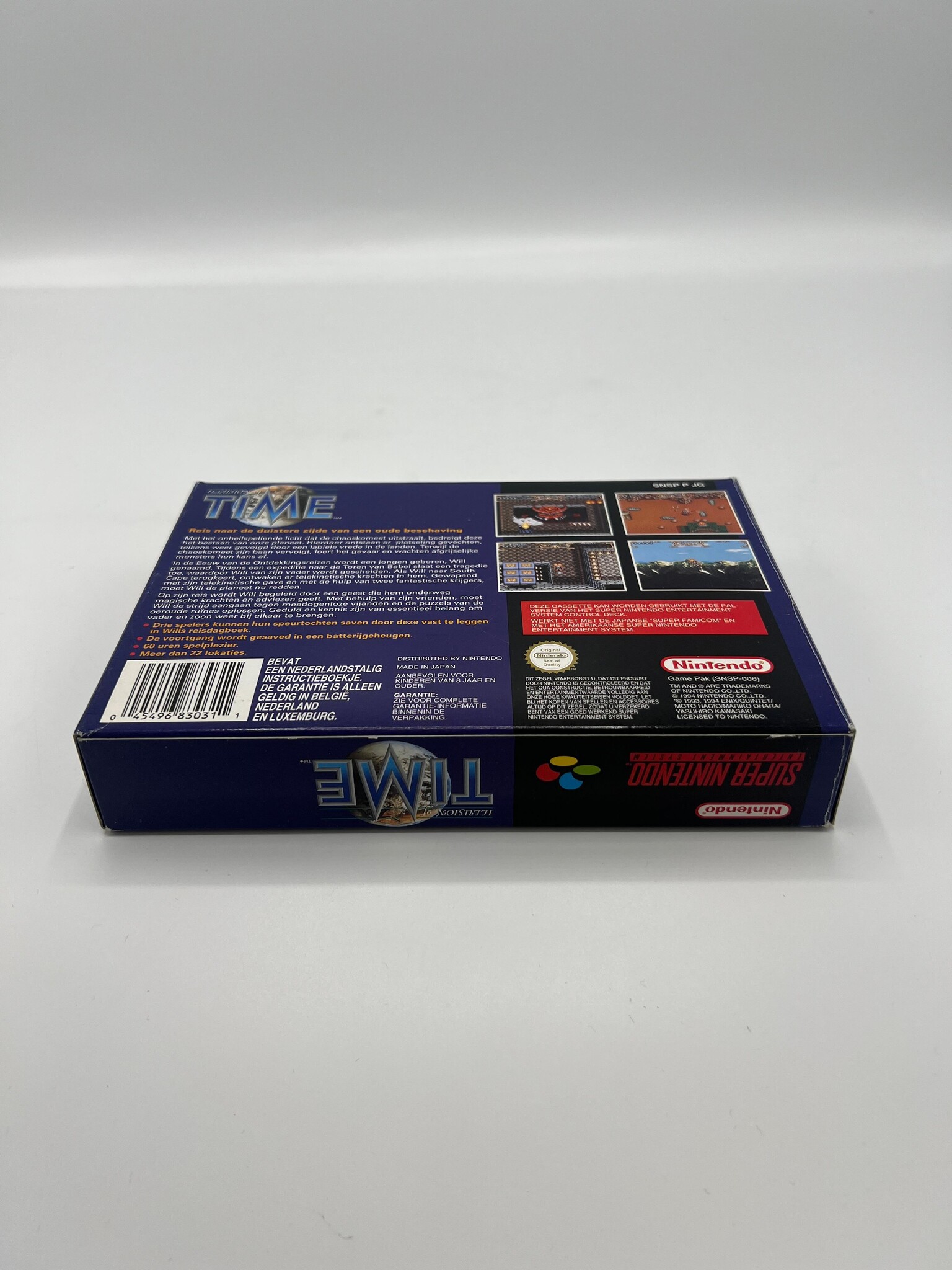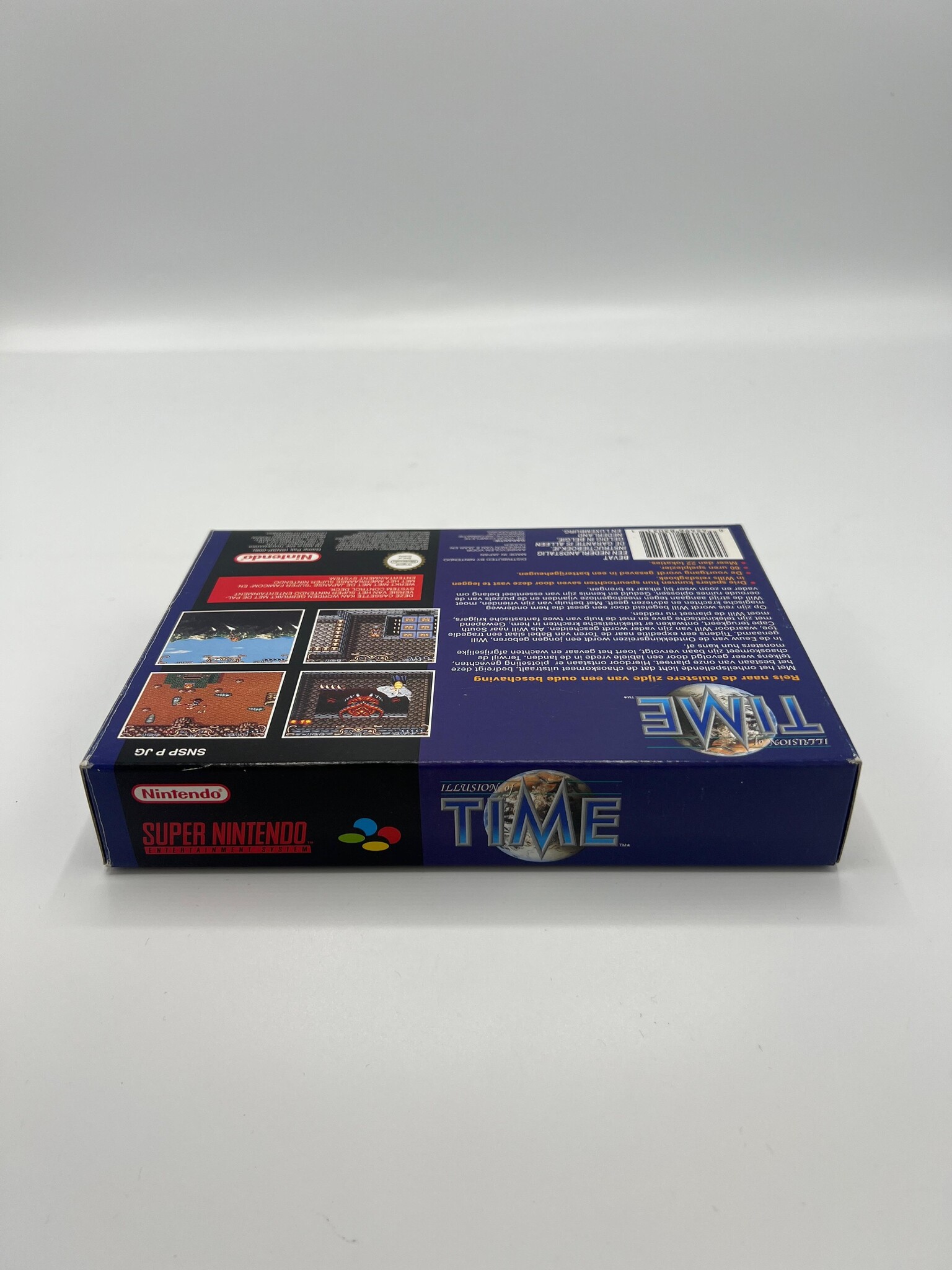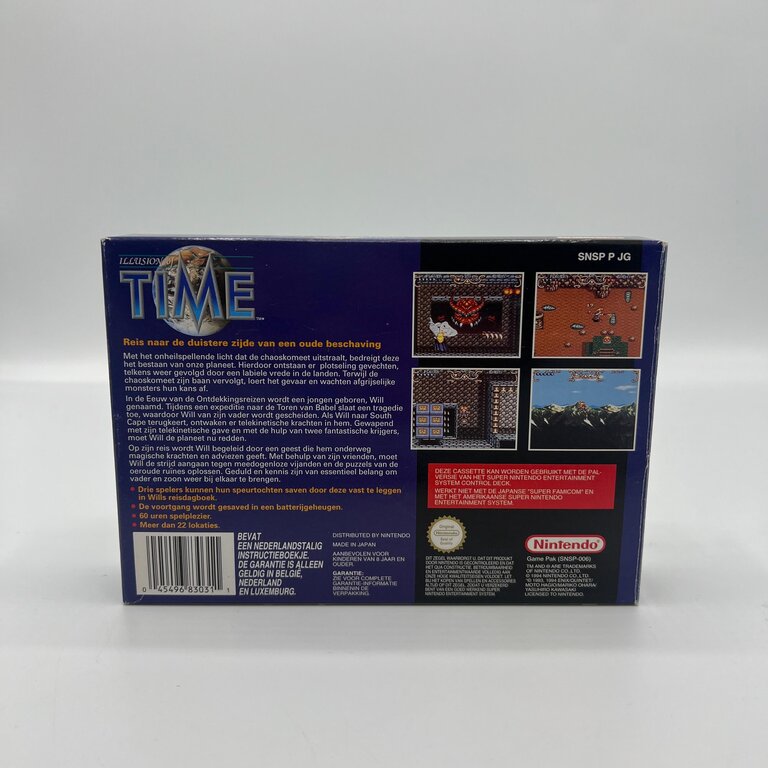 Illusion of Time is een geliefde actie-RPG op de Super Nintendo waarin je als Will op reis gaat langs mysterieuze ruïnes en historische locaties om een dreigend kwaad te stoppen. De game combineert real-time gevechten, puzzels en een meeslepend verhaal met sterke personages en een unieke sfeer die hem tot een cultklassieker maken. De HOL-uitgave is extra interessant voor verzamelaars van Nederlandse PAL-releases binnen de Super Nintendo-catalogus.