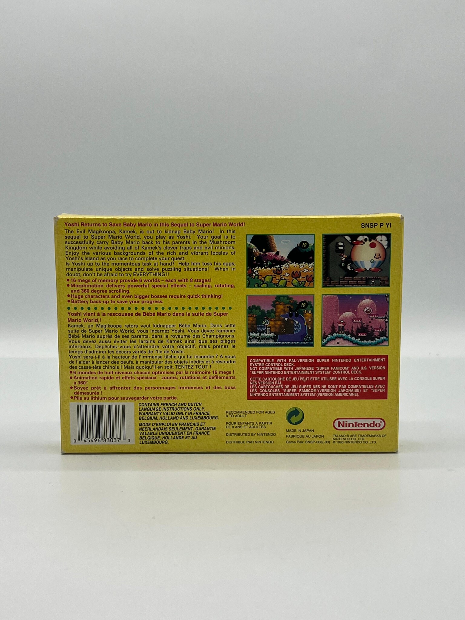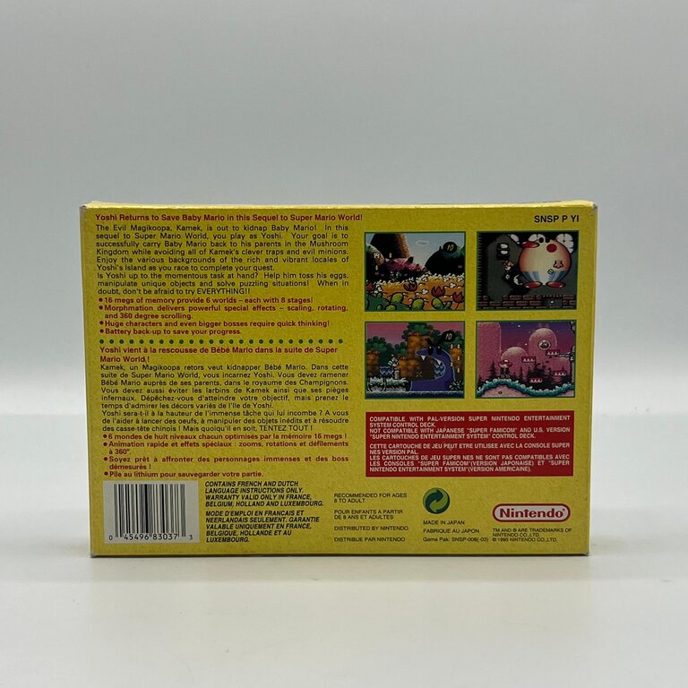 Yoshi’s Island is een meesterlijke platformgame waarin Yoshi Baby Mario door kleurrijke, handgetekende werelden begeleidt vol creatieve obstakels, verborgen geheimen en inventieve eindbazen. De game onderscheidt zich door zijn unieke grafische stijl, vernieuwende gameplay en perfect uitgebalanceerde leveldesign, waardoor het tot de absolute top van de SNES-catalogus behoort. Een tijdloze Nintendo-klassieker die nog altijd geldt als een van de beste platformgames ooit gemaakt.