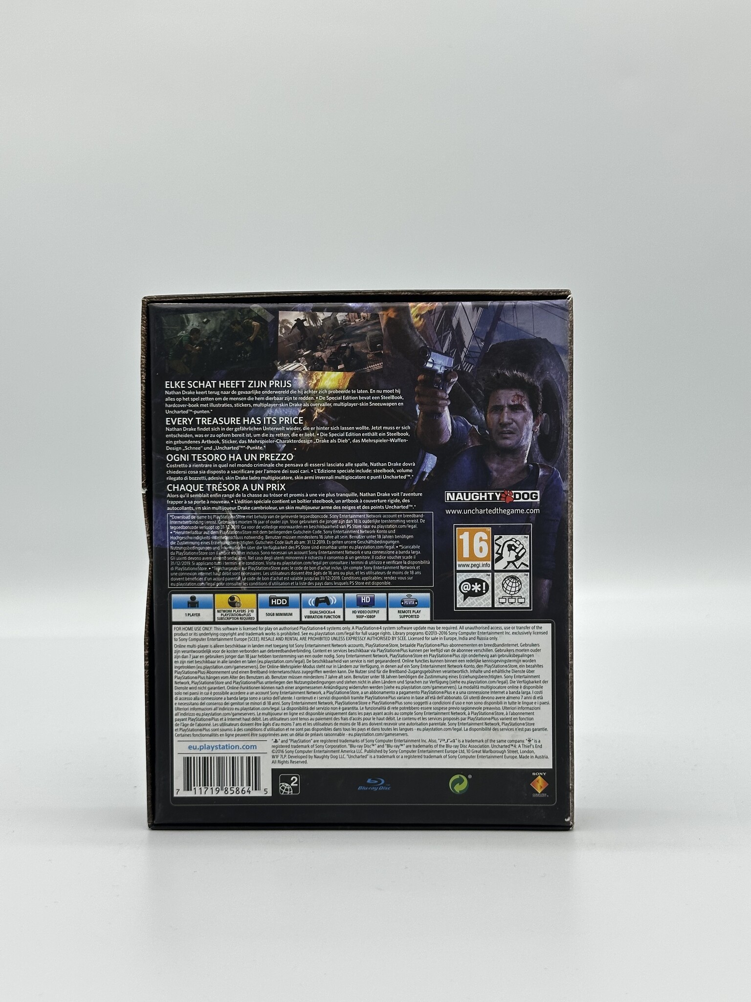 In deze spectaculaire afsluiter van Nathan Drake’s avontuur keer je nog één keer terug in een adembenemende mix van actie, verhaal en verkenning. Uncharted 4 combineert filmische setpieces met strakke gunplay, puzzels en prachtige omgevingen, terwijl het verhaal dieper ingaat op Drake’s verleden en zijn band met zijn familie en vrienden. De Special Edition maakt deze uitgave extra aantrekkelijk voor verzamelaars en fans die deze moderne klassieker in een mooiere uitvoering willen hebben.